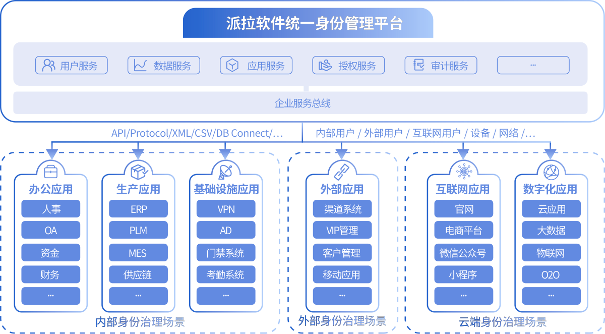 融合业界标准成熟的接口与协议,包括WebService、Restful API、JDBC、LDAP、XML、JDBC、AD连接器等,适配各类型应用集成接入